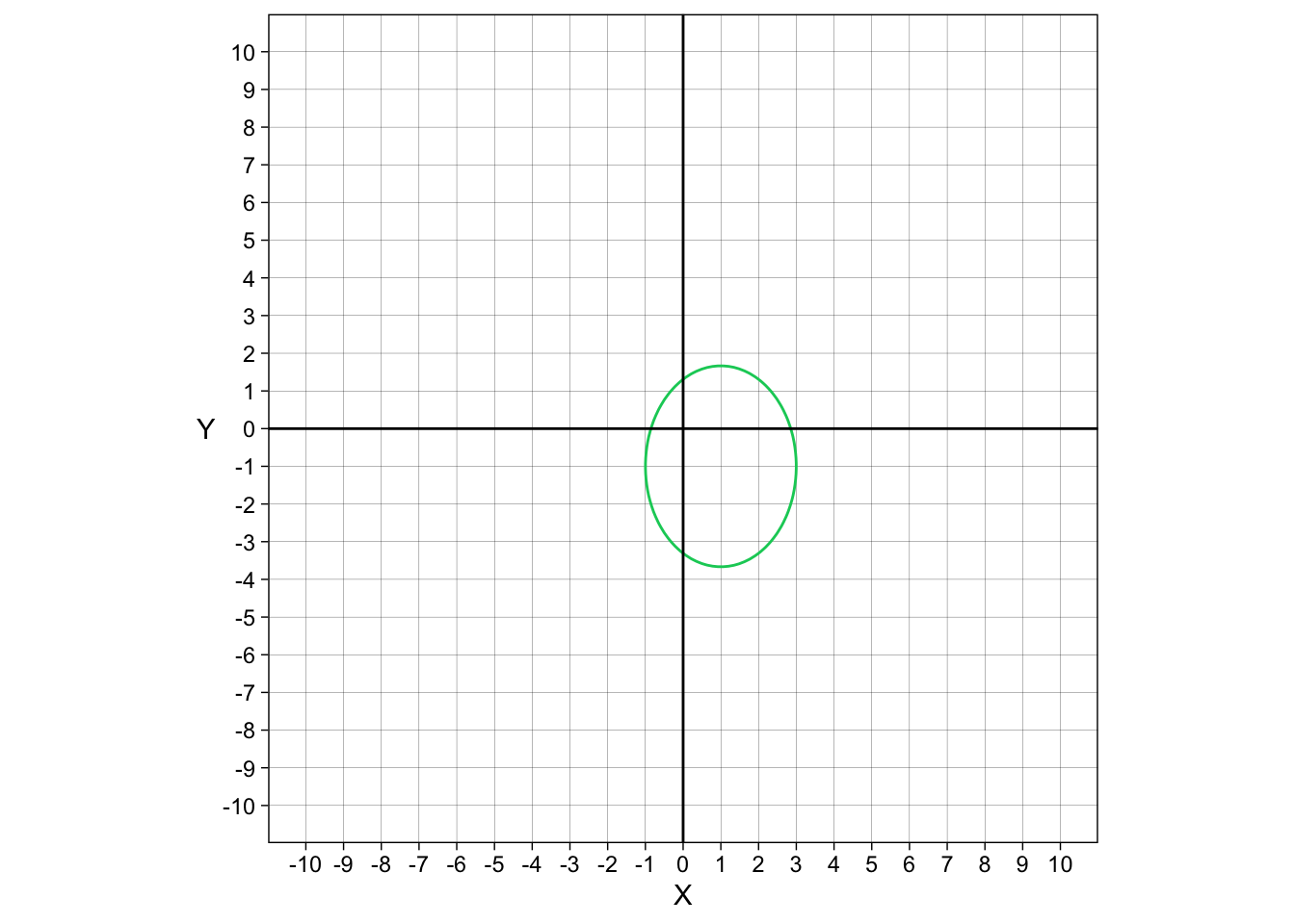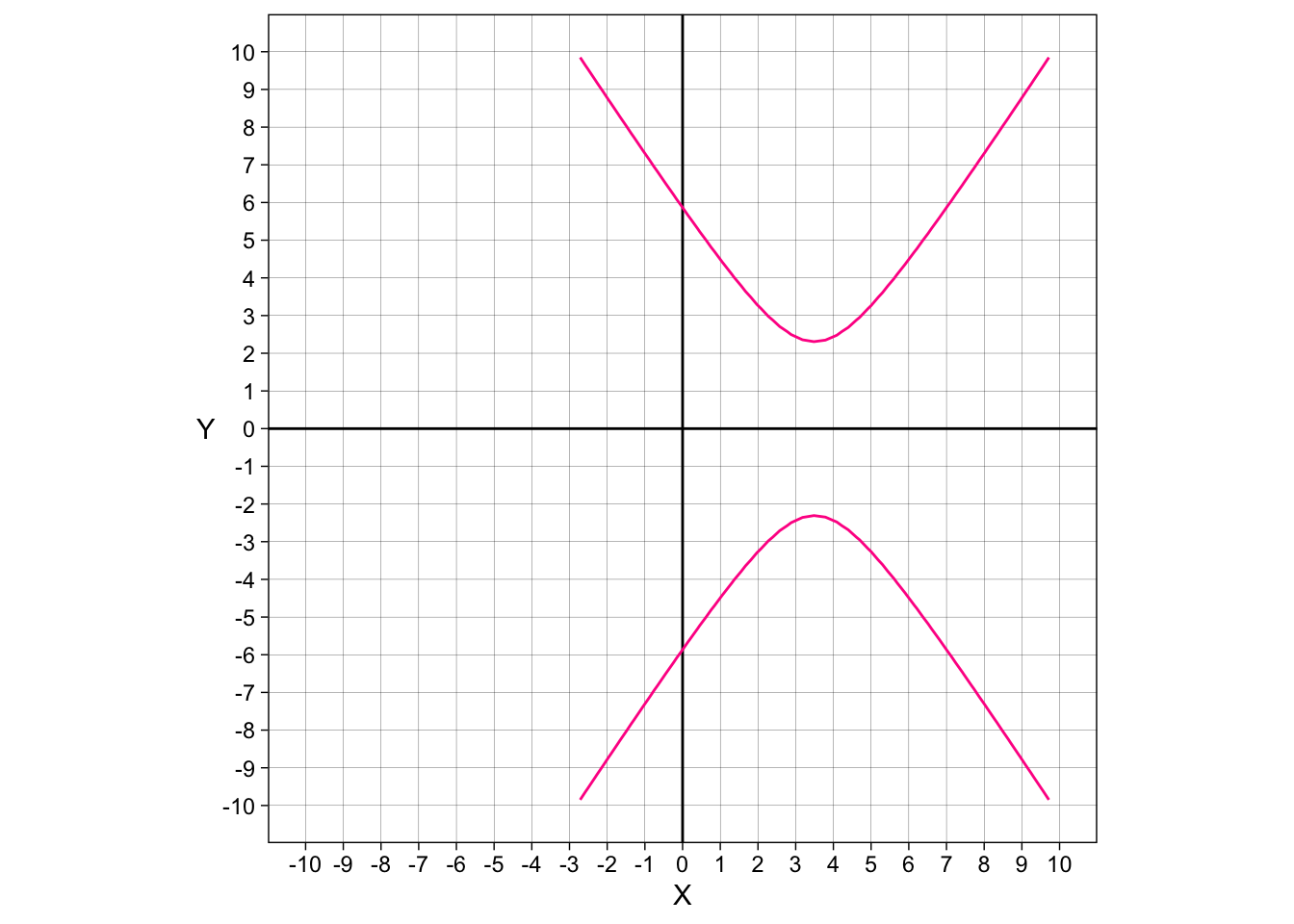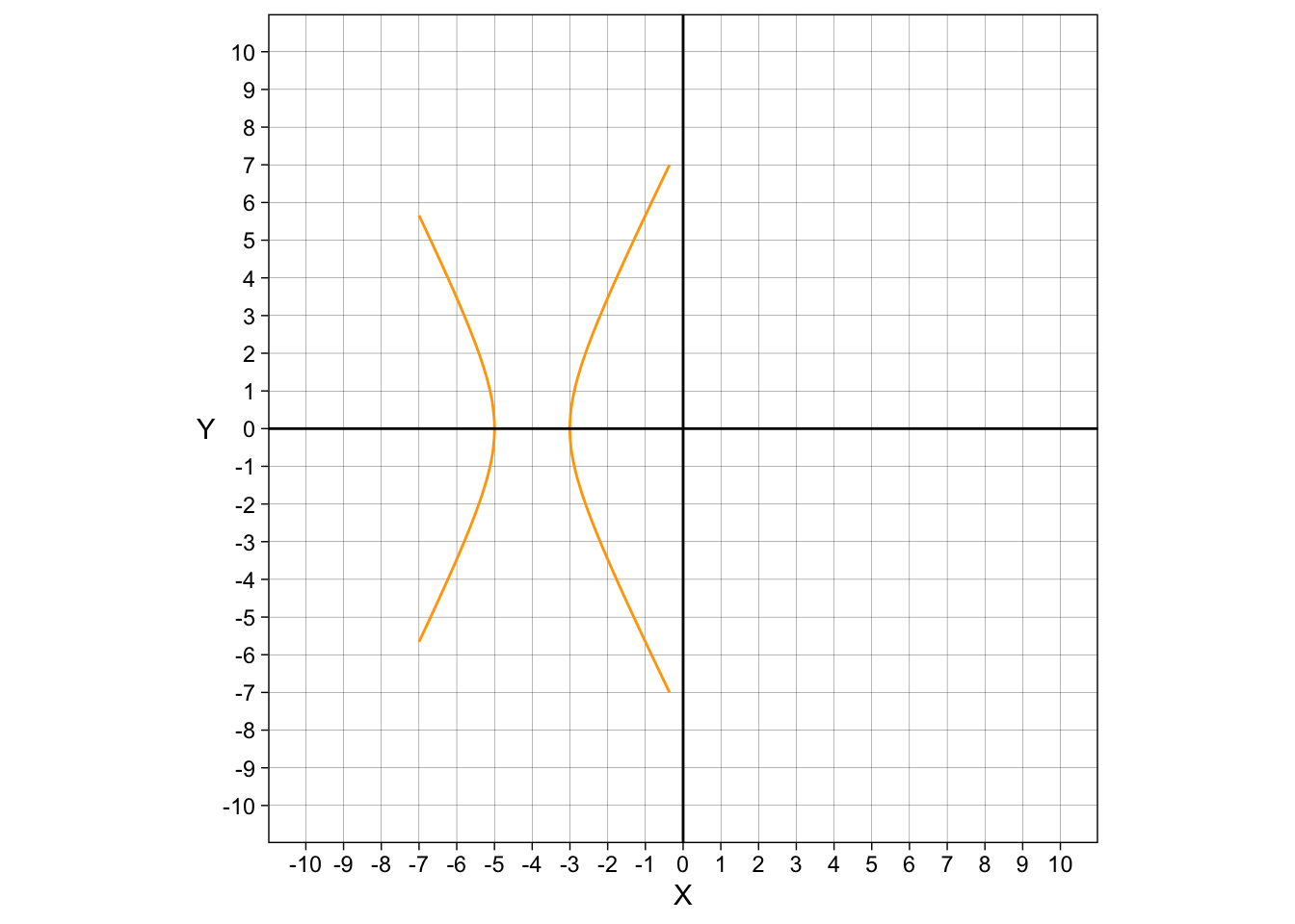 Thankfully, making a \(y\) is not a lot of work. We don’t have to type in every single number from \(-∞\) to \(+∞\). We just have to give a range of numbers. We could use a variety of commands, like tibble, but I found that expand_grid works best. We don’t need very many numbers, so \(-7\) to \(7\) will work just fine for our purposes. We will also have to do this for the rest of the conic sections.