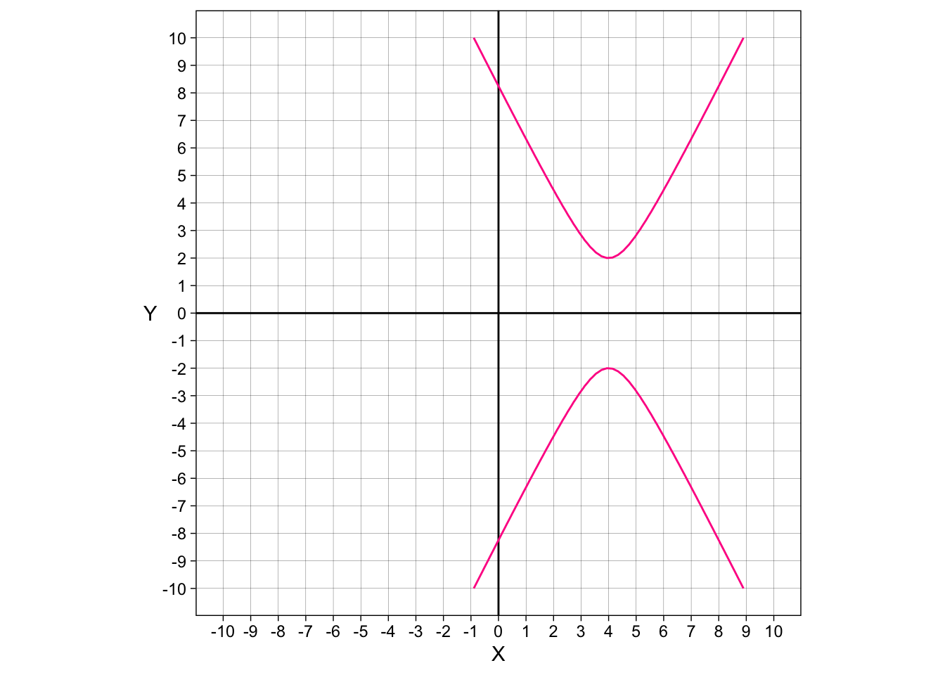 \[\frac{y^2}{2^2}-\frac{(x-4)^2}{1^2} =1\] We will write this equation as a function, and make data for an \(x\) and a \(z\) this time, with a range of \(10\) to \(-10\).