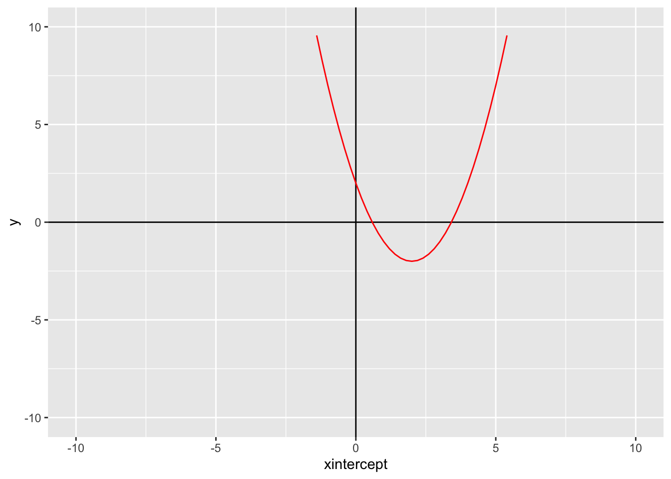 This makes a really zoomed in plot. I want to see the whole parabola though. We can set different limits using xlim() and ylim(). We will also add some vertical and horizontal lines to make the different quadrants of the Cartesian plane more apparent, and change the color of the parabola to make it more visible. I’m also going to switch the order so the parabola shows up on top.